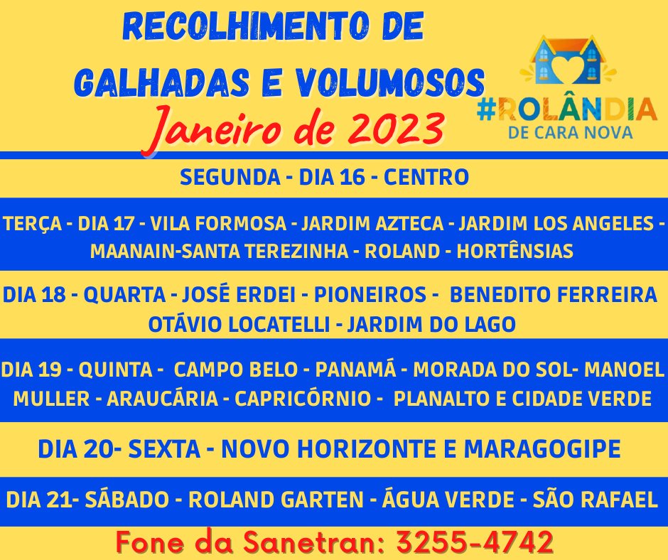 AGENDA DA SANETRAN PARA RECOLHER GALHADAS E VOLUMOSOSA secretaria de Agricultura e Meio Ambiente informa que a empresa terceirizada que presta serviço ao município, a SANETRAN, dividiu a cidade em 14 regiões, sendo doze setores na área urbana e m...