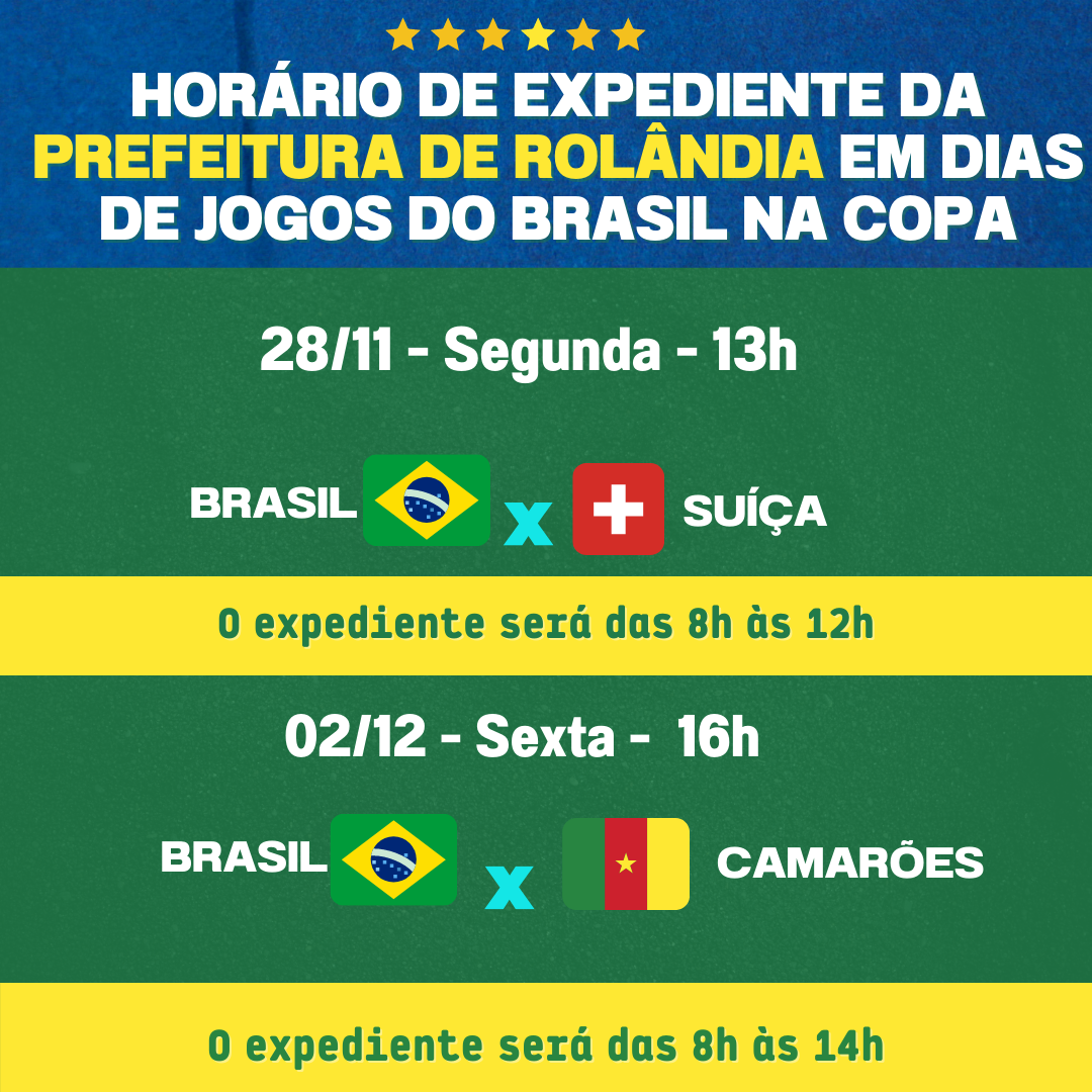 DEVIDO AOS JOGOS DO BRASIL NA COPA DO MUNDO, PREFEITURA ALTERA HORÁRIO DE EXPEDIENTEPor meio do Decreto Municipal 477, a Prefeitura de Rolândia faz adequações em seus horários de atendimento ao público devido aos jogos da Copa do Mundo Fifa 202...