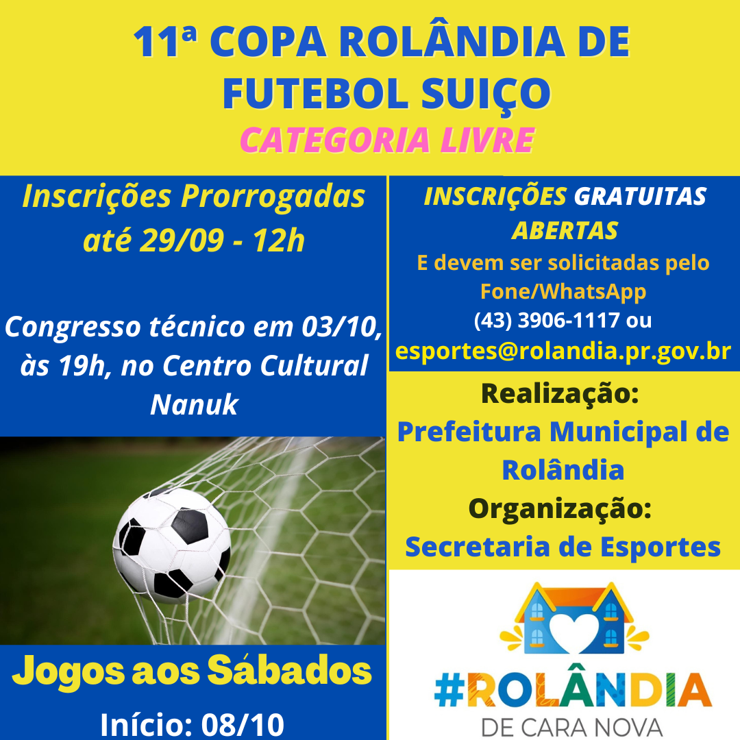 SECRETARIA DE ESPORTES ABRE INSCRIÇÕES PARA A 11º COPA ROLÂNDIA DE FUTEBOL SUIÇOA Secretaria de Esportes informa que está aberto o prazo de inscrições para a 11º Copa Rolândia de Futebol Suiço - categoria livre.Vagas limitadas.Mais informa...
