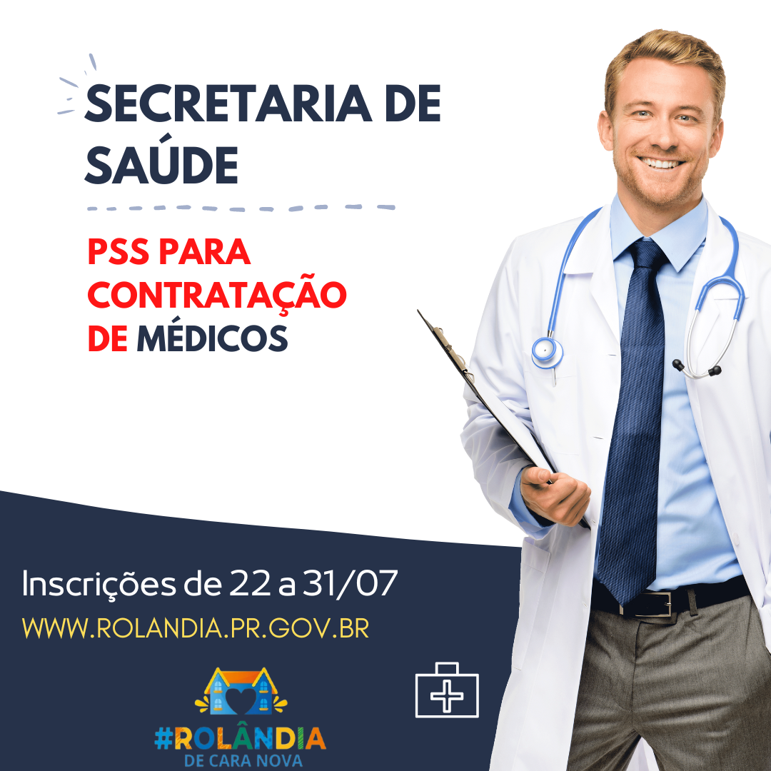 PSS PARA CONTRATAÇÃO DE MÉDICOS PARA A SAÚDE DE ROLÂNDIAA secretaria de Saúde vem tornar público a abertura de Processo Seletivo Simplificado (PSS) para contratação, por prazo determinado, com fundamentos nas Leis Complementares Municipais d...