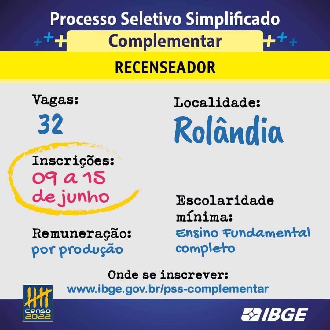 IBGE lança processo seletivo com 32 vagas para RolândiaO IBGE abriu as inscrições para um processo seletivo com 4.359 vagas no Paraná.São 32 vagas para Rolândia.As oportunidades de emprego temporário são para trabalhar no Censo 2022, no carg...