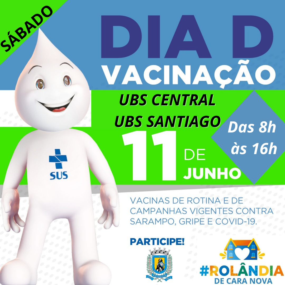 NESTE SÁBADO É "DIA D" DE VACINAÇÃOA secretaria de Saúde chama toda a população para, neste sábado, dia 11 de junho, das 8h às 16h, NA UBS CENTRAL E NA UBS SANTIAGO, participar do dia "D da vacinação".A ação vai reforçar a necessidade d...