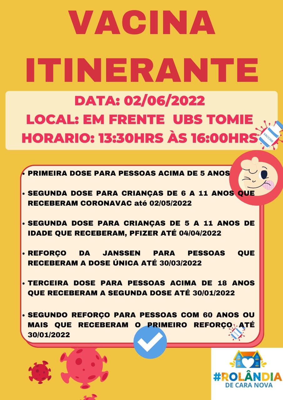 NESTA QUINTA TEM VACINA ITINERANTE CONTRA A COVID-19 QUINTA * EM FRENTE A UBS TOMIE*13h30 às 16h *PRIMEIRA DOSE PARA PESSOAS ACIMA DE 5 ANOS* *SEGUNDA DOSE PARA CRIANÇAS DE 6 A 11 ANOS QUE RECEBERAM CORONAVAC ATÉ 02/05/2022* *SEGUNDA DOSE PARA CRI...