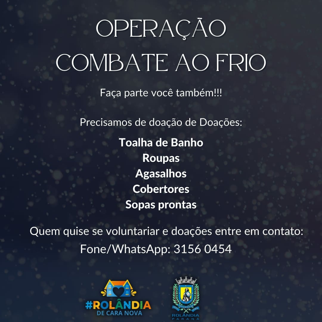 HOJE TEM DE NOVO!OPERAÇÃO COMBATE AO FRIOA secretaria de Assistência Social vai fazer nesta quarta-feira, mais uma operação "Combate ao frio".O trabalho leva acolhimento, guarida, agasalhos e ajuda aos moradores de rua de Rolândia e a quem prec...
