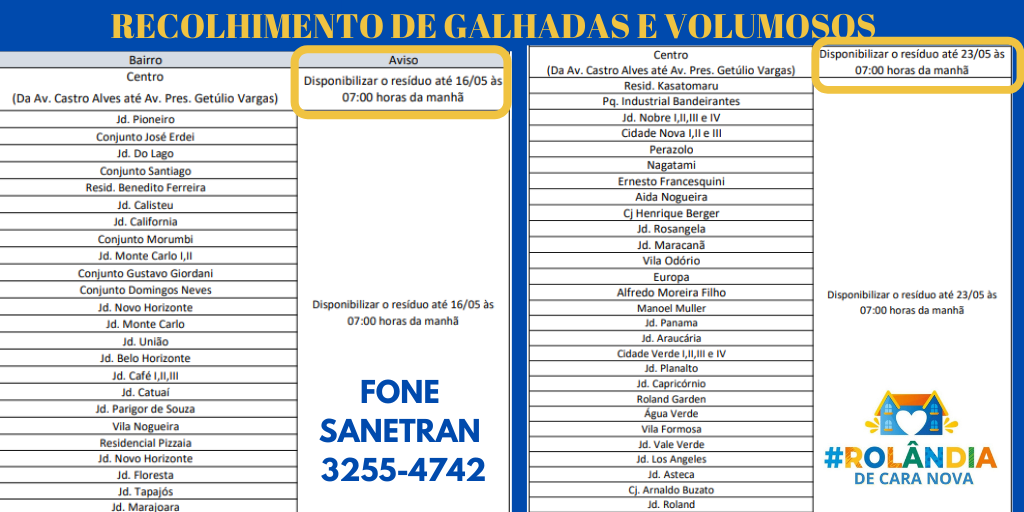 AGENDA DA SANETRAN PARA RECOLHER GALHADAS E VOLUMOSOSA Secretaria de Agricultura e Meio Ambiente informa que a empresa terceirizada que presta serviço ao município, a SANETRAN, dividiu a cidade em 14 regiões, sendo doze setores na área urbana e m...