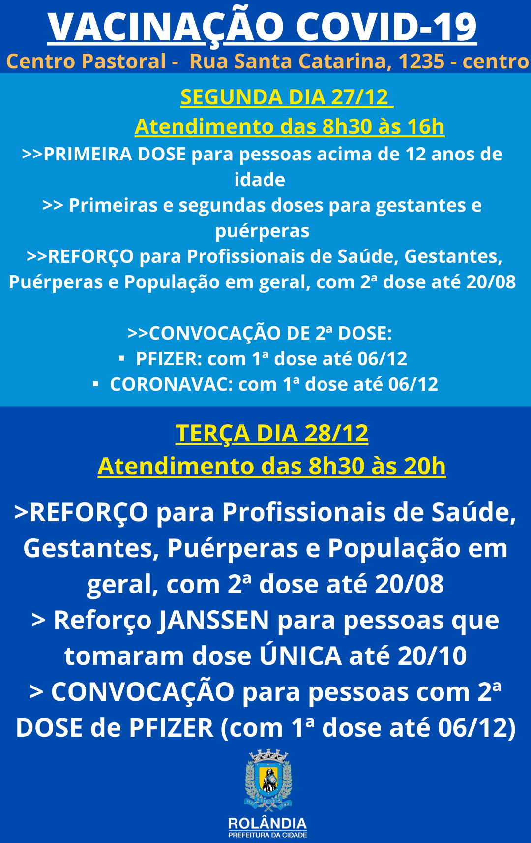 VACINAÇÃO CONTRA A COVID-19 NA SEGUNDA E TERÇA NO CENTRO DE PASTORALA secretaria de Saúde informa que na última semana do ano, serão ministradas vacina contra a covid-19 na segunda, dia 27 e terça dia 28, no Centro Municipal de Vacinação con...