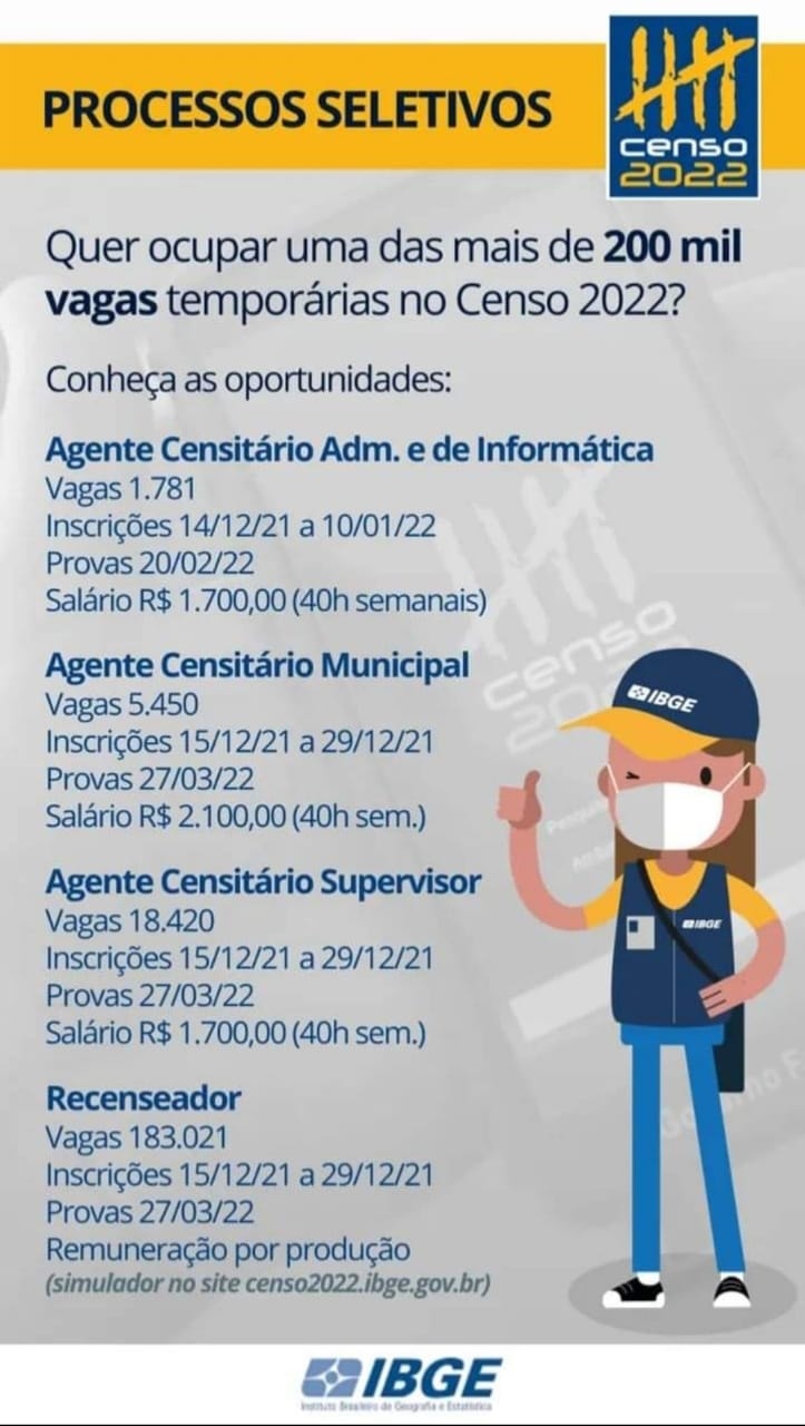 OPORTUNIDADE DE TRABALHO PARA ROLÂNDIAIBGE - PSS CENSO DEMOGRÁFICO 2022CARGOS:1) AGENTE CENSITÁRIO:-Requisito: Ensino Médio Completo-Jornada de trabalho: 40 horas semanais, sendo 8 horas diárias-Previsão de duração do contrato: 5 meses-Taxa d...