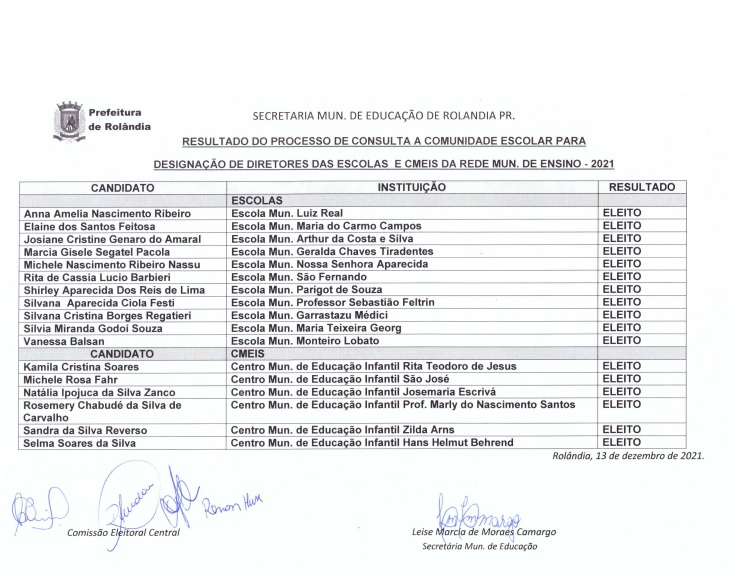 A secretaria de Educação divulga o resultado provisório do processo eleitoral para a escolha de diretores de escolas municipais e CMEI´s. Participaram do processo dez escolas (em todas, chapa única) e seis CMEI`s (em dois com mais de uma chapa...