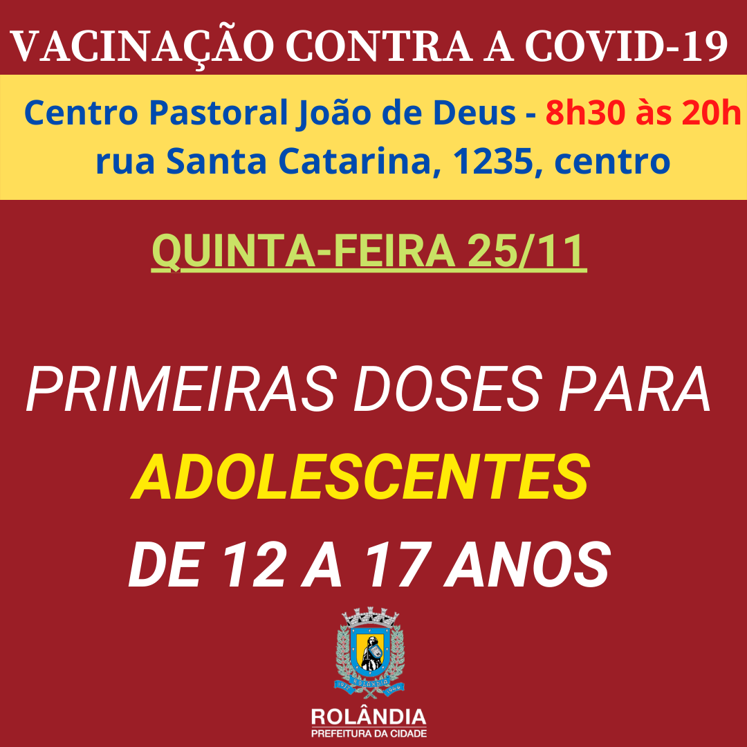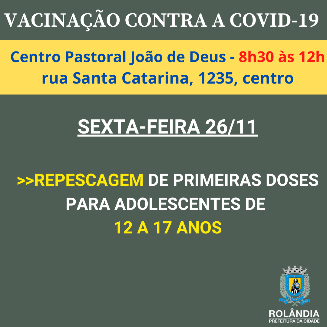 ATENÇÃO: MUDANÇA NA VACINAÇÃO CONTRA A COVID-19 DE SEXTAA Secretaria Municipal de Saúde informa que a vacinação contra a covid-19, desta sexta-feira, dia 26 de novembro, no Centro Municipal de Vacinação, na rua Santa Catarina, 135, cent...