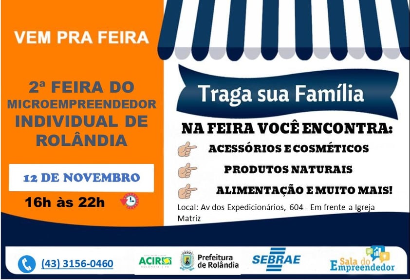 ROLÂNDIA TERÁ FEIRA MEI NO DIA 12 DE NOVEMBROA Secretaria Municipal de Desenvolvimento Econômico, por meio da Sala do Empreendedor de Rolândia, em parceria com o SEBRAE e ACIR, vão promover a 2ª edição da "FEIRA MEI" de Rolândia, a ser reali...