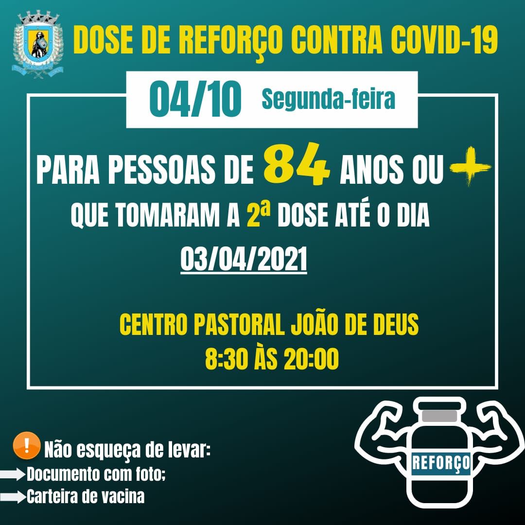 HOJE - SEGUNDA-FEIRA (04/10) TEMOS DOSE DE REFORÇO (TERCEIRA DOSE) ATÉ 20 HORAS PARA 84 ANOS OU MAIS - NO CENTRO PASTORAL JOÃO DE DEUS ? Segunda-feira (04/10) ? 08:30 às 20:00 horas ? *84 anos ou mais que receberam segunda dose até 03/04* ? ...