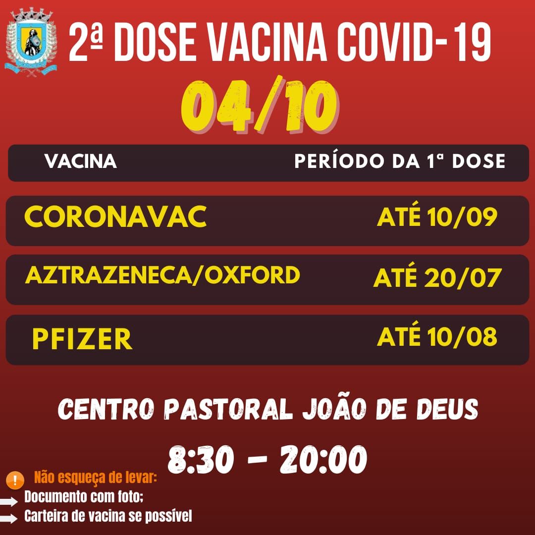 HOJE - SEGUNDA-FEIRA (04/10) TAMBÉM TEMOS SEGUNDA DOSE ATÉ ÀS 20 HORAS NO CENTRO PASTORAL JOÃO DE DEUS - CONFIRA A PROGRAMAÇÃO ? *ASTRAZENECA/OXFORD - pessoas que receberam a primeira dose até 20/07* ? *PFIZER - pessoas que receberam a prime...