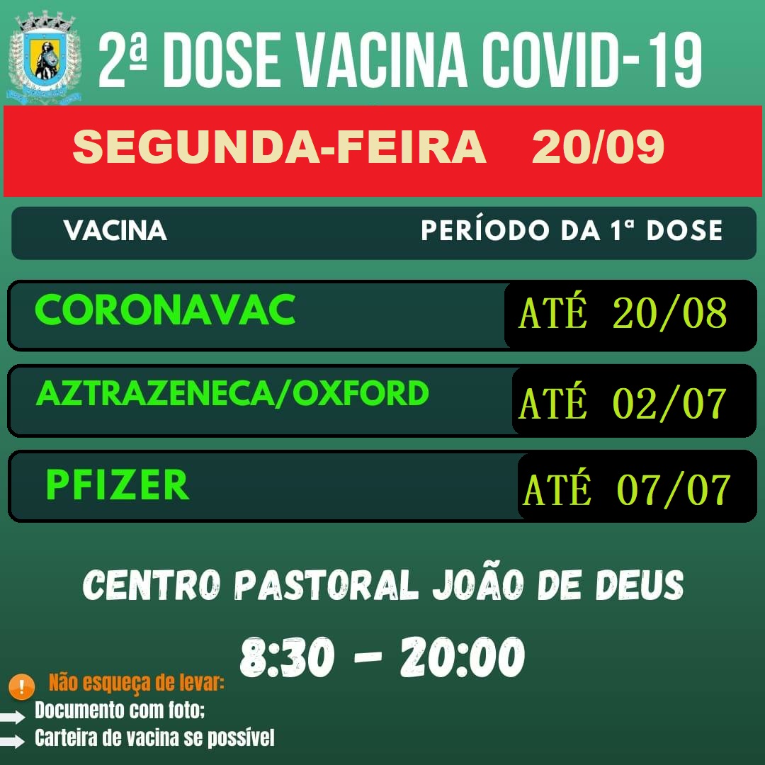 AÇÃO DE VACINAÇÃO SEGUNDA DOSE CONTRA A COVID-19SEGUNDA-FEIRA - 20/09NO CENTRO PASTORAL JOÃO DE DEUS DAS 8H30 ÀS 20 HORAS *ASTRAZENECA/OXFORD - pessoas que receberam a primeira dose até 02/07* *PFIZER - pessoas que receberam a primeira dose ...