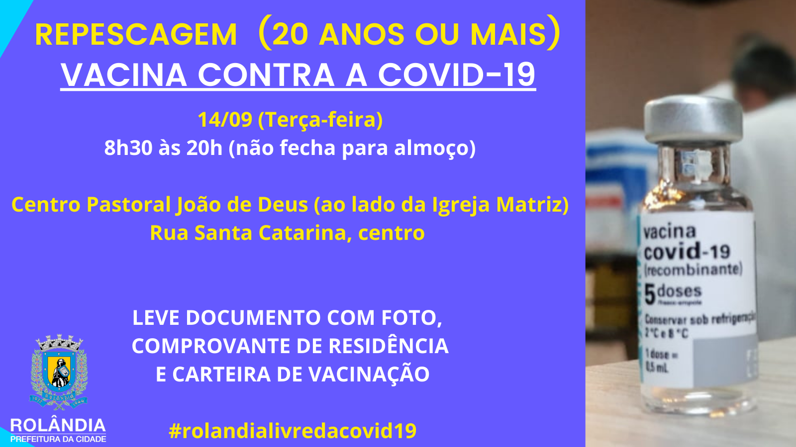 REPESCAGEM VACINAÇÃO CONTRA A COVID-19TERÇA-FEIRA (14/09) TEM REPESCAGEM PARA PESSOAS DE 20 ANOS OU MAIS NO CENTRO PASTORAL JOÃO DE DEUS* 14/08 (Terça-feira)8h30 às 20 horasCentro Pastoral João de Deus (ao lado da Igreja Matriz)LEVE DOCUMENTO...