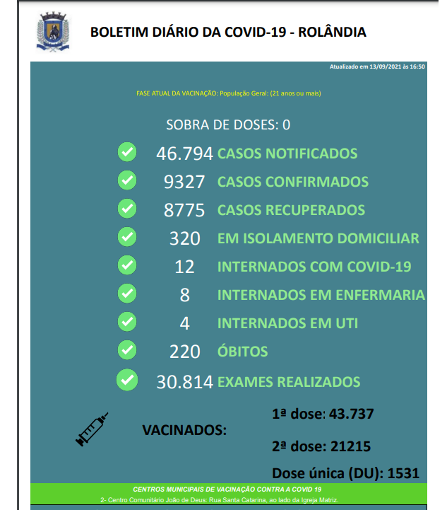 BOLETIM COVID-19 - 13/09/2021 A Secretaria Municipal de Saúde informa sobre casos de covid-19.Nas últimas horas foram registrados 200 pacientes curados e 138 contaminações.Rolândia tem atualmente 332 pacientes com covid-19: 320 em isolame...