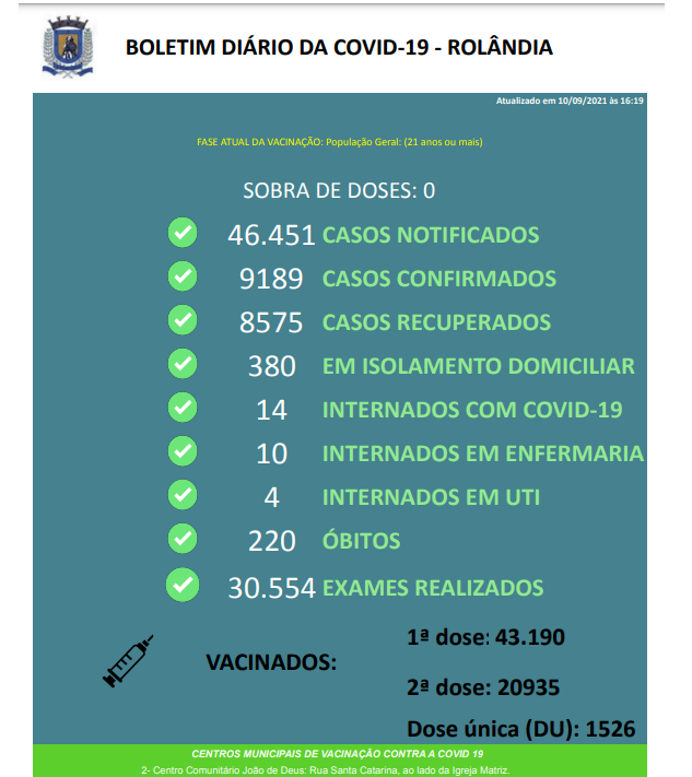BOLETIM COVID-19 - 10/09/2021 A Secretaria Municipal de Saúde informa sobre casos de covid-19.Nas últimas horas foram registrados 130 pacientes curados e 111 contaminações.Rolândia tem atualmente 394 pacientes com covid-19: 380 em isola...