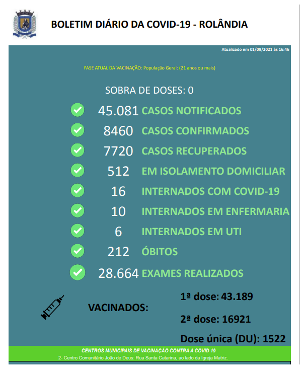 BOLETIM COVID-19 - 02.09.21A Secretaria Municipal de Saúde informa sobre casos de covid-19: foram registrados 79 pacientes curados e 44 contaminações.Rolândia tem atualmente 492 pacientes com covid-19: 475 em isolamento domiciliar e 17 ...