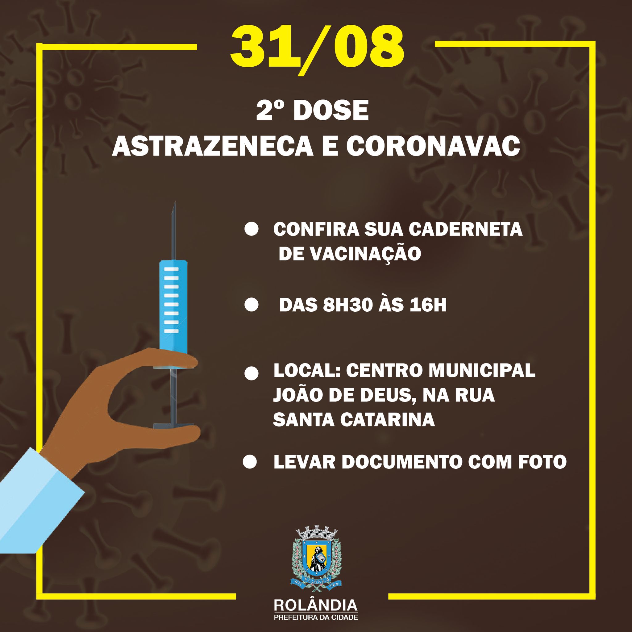 VACINAÇÃO SEGUNDA DOSE DE CORONAVAC E ASTRAZENECA OLHE SUA CADERNETA DE VACINAÇÃO CONTRA A COVID-19. CHEGOU A DATA DA SEGUNDA DOSE DE CORONAVAC OU ASTRAZENECA? Se sim, pode vir, nesta terça-feira, dia 31 de agosto, das 8h30 às 16h, no Centro...