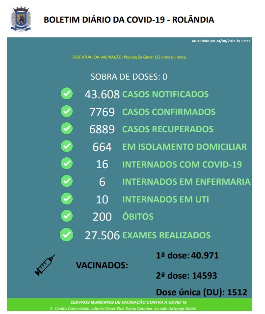 BOLETIM COVID-19 - 24/08/2021A Secretaria Municipal de Saúde informa sobre casos de covid-19: foram registradas 192 contaminações e 181 pacientes curados.Rolândia tem atualmente 680 pacientes com covid-19: 664 em isolamento domiciliar e 16 intern...