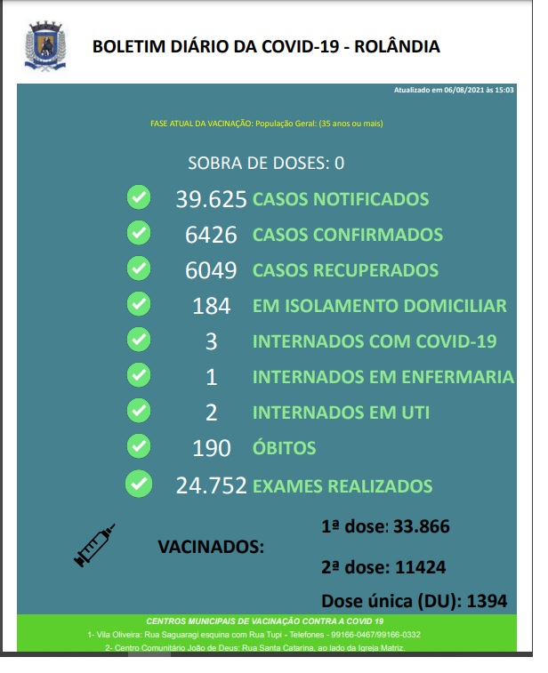 MAIS 304 ROLANDENSES RECEBERAM A PRIMEIRA DOSE HOJE CONTRA A COVID-19; NO TOTAL, FORAM APLICADAS 380 DOSESA Secretaria Municipal de Saúde informa que, das 8h30 às 16h desta quinta-feira, dia 6 de agosto, vacinou 304 pessoas contra a covid-19, no ...