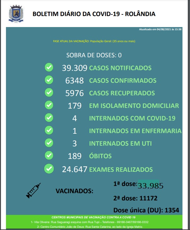BOLETIM COVID-19A Secretaria Municipal de Saúde informa sobre casos de covid-19 nas últimas horas: foram registradas 49 contaminações e 10 pacientes curados.Rolândia tem atualmente 183 pacientes com covid-19, sendo 179 em isolamento domiciliar e...