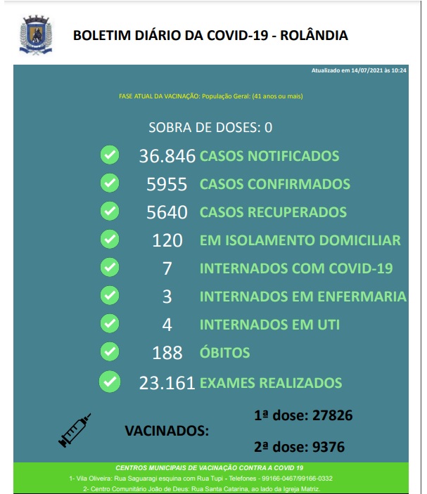 A Secretaria Municipal de Saúde informa que, sobre casos de covid-19, foram registradas 17 novas contaminações e 11 pacientes curados. Rolândia tem atualmente 127 pacientes com covid-19, sendo 120 em isolamento domiciliar e 7 internados em hosp...
