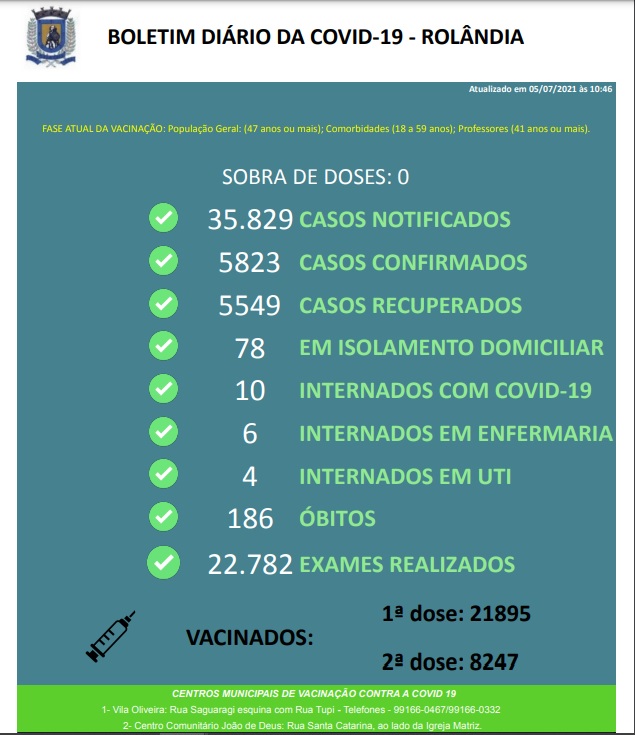 BOLETIM COVID-19A Secretaria Municipal de Saúde informa que foram registradas três mortes de pacientes em decorrência da covid-19: 1- 24 anos, sexo femininoEstava no Hospital São RafaelÓbito: 01/07/2021Exame positivo 02/07/2021 - colhido pós ...