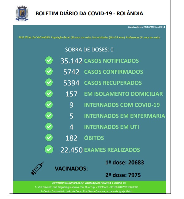 A Secretaria Municipal de Saúde informa que foram registradas 68 novas contaminações nos últimos dias. Rolândia tem atualmente 166 pacientes com covid-19, sendo 157 em isolamento domiciliar e 9 internados em hospitais (sendo quatro em UTI). S...