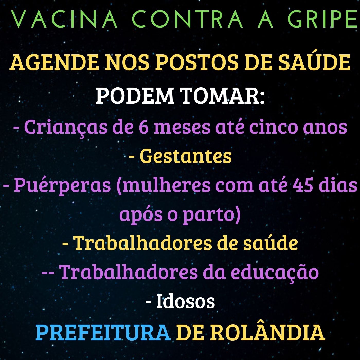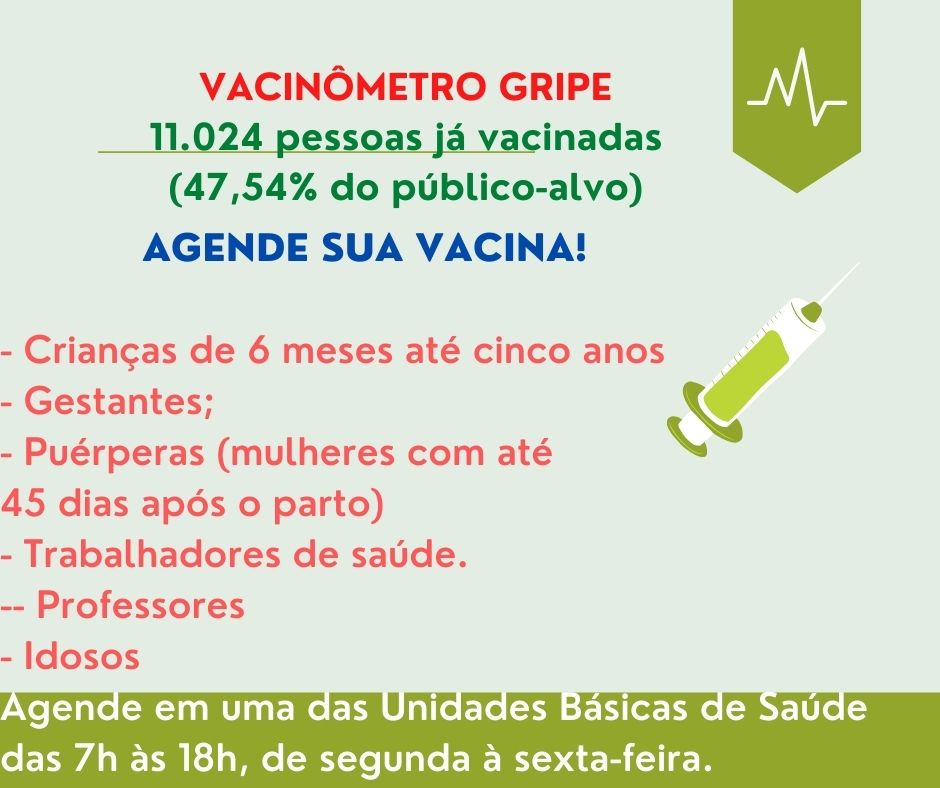 A Secretaria Municipal de Saúde informa que a campanha de vacinação contra a gripe prossegue por agendamento.Para evitar aglomerações, as vacinas são ministradas somente por agendamento, baseado no cadastro do SUS que cada Unidade Básica de ...