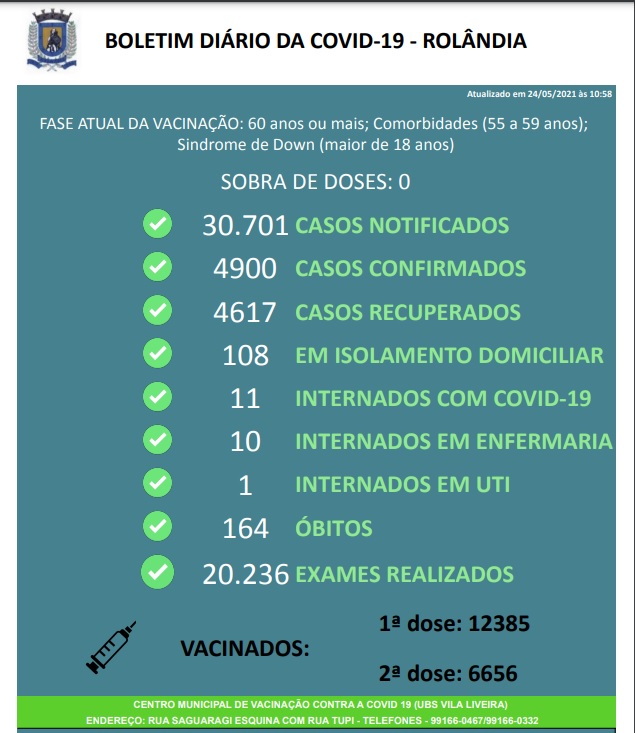 Com pesar e solidariedade aos parentes e amigos, a Secretaria Municipal de Saúde informa o registro de um óbito de pacientes da cidade em decorrência de covid-19:Sexo feminino, 68 anosExame positivo em: 18/05/2021Estava internada no HU, em Londri...