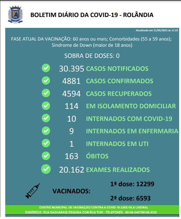 A Secretaria de Saúde informa que vacinou hoje, em Drive Thru no 15° BPM, 370 idosos com 60 anos ou mais, na campanha de imunização contra a gripe. 60-69 anos: 122 doses70-79 anos: 79 dosesAcima de 80 anos: 175 dosesTotal: 376 doses...