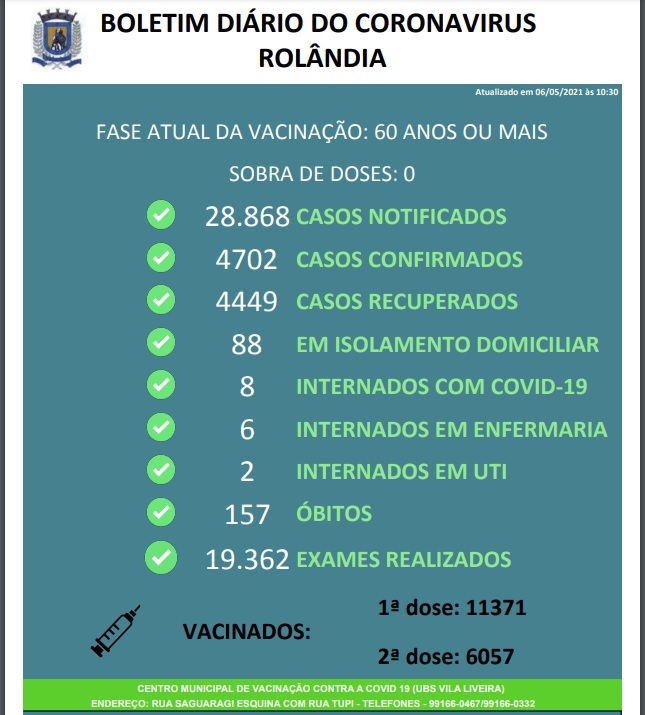 A Secretaria Municipal de Saúde informa que já vacinou 11.371 pessoas contra a covid-19 em 1º dose e 6.057 em segunda dose contra a covid-19.O resultado coloca um percentual de cobertura populacional que, a cada seis rolandenses, um já recebeu pe...