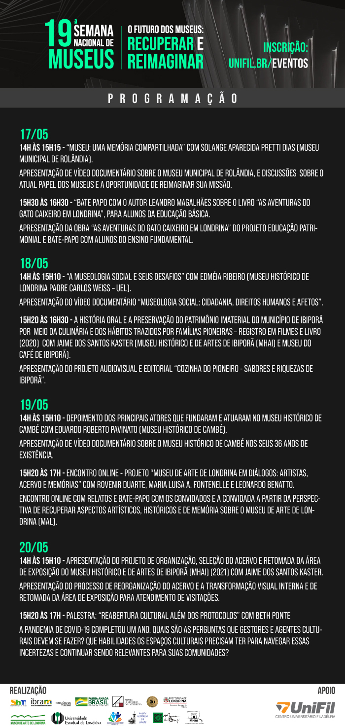 A Secretaria de Cultura e Turismo informa que estão abertas as inscrições para a 19ª Semana Nacional de Museus. O tema definido para esta edição é: "O futuro dos museus: recuperar e reimaginar". A programação local será online e gratui...