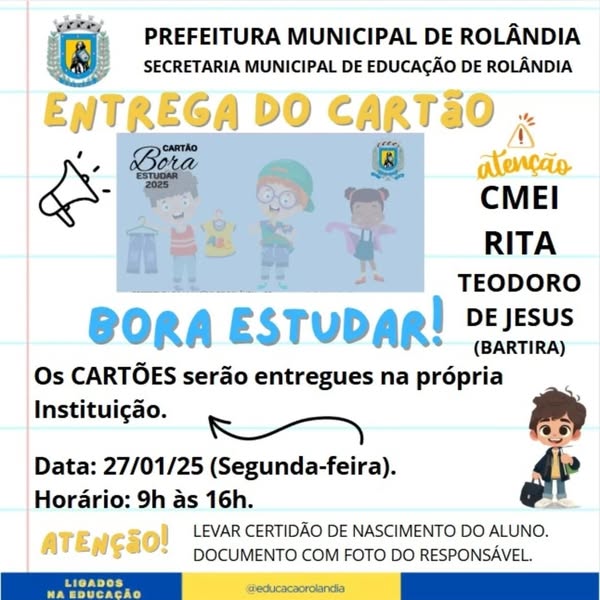 CRONOGRAMA PARA MATRÍCULAS NOVAS NA REDE MUNICIPAL DE ENSINO DE ROLÂNDIA A Secretaria Municipal de Educação, divulga cronograma para matrículas novas na Rede Municipal de Ensino de Rolândia. O respons&aac...